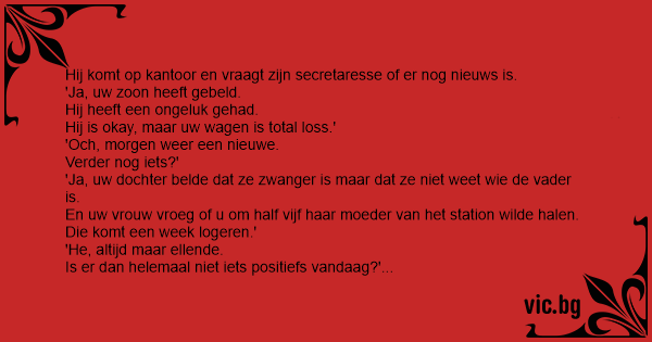 Hij komt op kantoor en vraagt zijn secretaresse of er nog nieuws is. 'Ja, uw zoon heeft gebeld. Hij heeft een ongeluk gehad. Hij is okay, maar uw wagen is total loss.' 'Och, morgen weer een nieuwe. Verder nog iets?' 'Ja, uw dochter belde dat ze zwanger is maar dat ze niet weet wie de vader is. En uw vrouw vroeg of u om half vijf haar moeder van het station wilde halen. Die komt een week logeren.' 'He, altijd maar ellende. Is er dan helemaal niet iets positiefs vandaag?' 'Oh jawel, uw aids-test.'