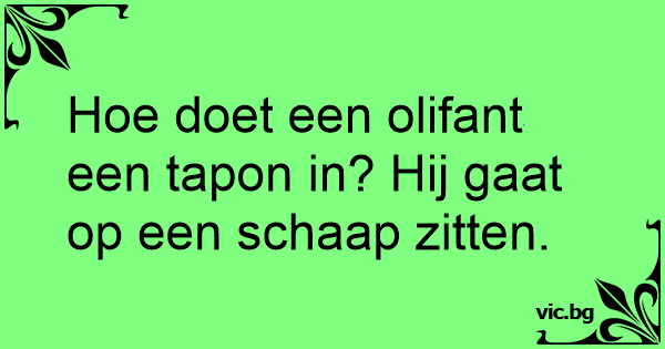 Ное doet een olifant een tapon in? Hij gaat op een schaap zitten.
