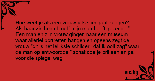 Een man en zijn vrouw gingen naar een museum waar allerlei portretten hangen en opeens zegt de vrouw "dit is het lelijkste schilderij dat ik ooit zag" waar de man op antwoordde " schat doe je bril aan en ga voor die spiegel weg"