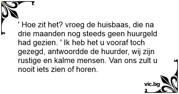 ' Ное zit het? vroeg de huisbaas, die na drie maanden nog steeds geen huurgeld had gezien. ' Ik heb het u vooraf toch gezegd, antwoordde de huurder, wij zijn rustige en kalme mensen. Van ons zult u nooit iets zien of horen.