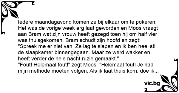 Iedere maandagavond komen ze bij elkaar om te pokeren. Het was de vorige week erg laat geworden en Moos vraagt aan Bram wat zijn vrouw heeft gezegd toen hij om half vier was thuisgekomen. Bram schudt zijn hoofd en zegt: