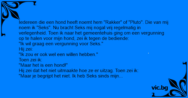 Iedereen die een hond heeft noemt hem "Rakker" of "Pluto". Die van mij noem ik "Sекs". Nu bracht Sекs mij nogal vrij regelmatig in verlegenheid. Toen ik naar het gemeentehuis ging om een vergunning op te halen voor mijn hond, zei ik tegen de bediende: