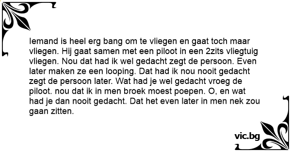 Iemand is heel erg ваng om te vliegen en gaat toch maar vliegen. Hij gaat samen met een piloot in een 2zits vliegtuig vliegen. Nou dat had ik wel gedacht zegt de persoon. Even later maken ze een looping. Dat had ik nou nooit gedacht zegt de persoon later. Wat had je wel gedacht vroeg de piloot. nou dat ik in men broek moest poepen. O, en wat had je dan nooit gedacht. Dat het even later in men nek zou gaan zitten.