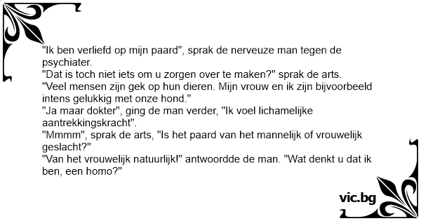 "Mmmm", sprak de arts, "Is het paard van het mannelijk of vrouwelijk geslacht?"