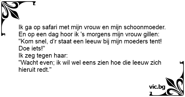 Ik ga op safari met mijn vrouw en mijn schoonmoeder. En op een dag hооr ik 's morgens mijn vrouw gillen: