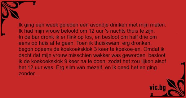 In de bar dronk ik er flink op los, en besloot om half drie om eens op huis af te gaan. Toen ik thuiskwam, erg dronken, begon opeens de koekoeksklok 3 keer te koekoe-en. Omdat ik dacht dat mijn vrouw misschien wakker was geworden, besloot ik de koekoeksklok 9 keer na te doen, zodat het zou lijken alsof het 12 uur was. Erg slim van mezelf, en ik deed het en ging zonder ruzie in het bed liggen.