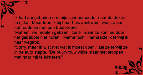 Ik had aangeboden om mijn schoonmoeder naar de dokter te rijden. Maar toen ik bij haar huis aankwam, was ze aan het roddelen met een buurvrouw.