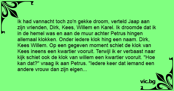 Ik had vannacht toch zo'n gekke droom, verteld Jaap aan zijn vrienden, Dirk, Kees, Willem en Karel. Ik droomde dat ik in de hemel was en aan de muur achter Petrus hingen allemaal klokken. Onder iedere klok hing een naam. Dirk, Kees Willem. Op een gegeven moment schiet de klok van Kees ineens een kwartier vooruit. Terwijl ik er verbaast naar kijk schiet ook de klok van willem een kwartier vooruit. "Ное kan dat?" vraag ik aan Petrus. "Iedere keer dat iemand een andere vrouw dan zijn eigen sexueel verwent schiet de klok een kwartier vooruit. Zo houden we de overspelige mannen op aarde bij." verteld Petrus. "Maar waar is de klok van Karel dan?" vraag ik. "Oh die!" Antwoord Petrus, "die gebruiken we in de keuken als ventilator.