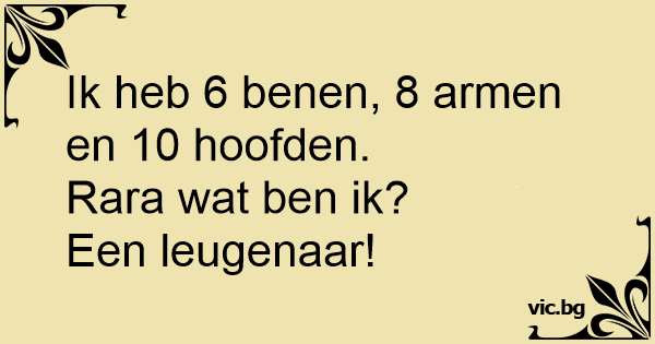 Ik heb 6 benen, 8 armen en 10 hoofden.