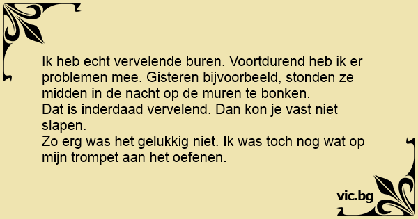 Ik heb echt vervelende buren. Voortdurend heb ik er problemen mee. Gisteren bijvoorbeeld, stonden ze midden in de nacht op de muren te bonken.
