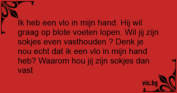 Ik heb een vlo in mijn hand. Hij wil graag op blote voeten lopen. Wil jij zijn sokjes even vasthouden ? Denk je nou echt dat ik een vlo in mijn hand heb? Waarom hou jij zijn sokjes dan vast