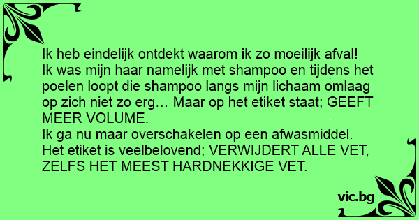 Ik heb eindelijk ontdekt waarom ik zo moeilijk afval! Ik was mijn haar namelijk met shampoo en tijdens het poelen loopt die shampoo langs mijn lichaam omlaag op zich niet zo erg… Maar op het etiket staat; GEEFT MEER VOLUME. Ik ga nu maar overschakelen op een afwasmiddel. Het etiket is veelbelovend; VERWIJDERT ALLE VET, ZELFS HET MEEST HARDNEKKIGE VET.