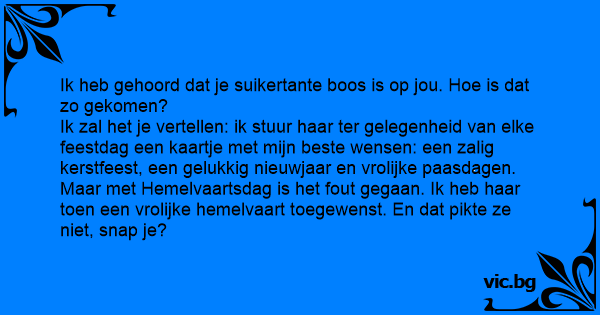 Maar met Hemelvaartsdag is het fout gegaan. Ik heb haar toen een vrolijke hemelvaart toegewenst. En dat pikte ze niet, snap je?