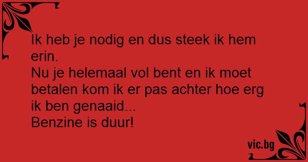 Ik heb je nodig en dus steek ik hem erin.<br />Nu je helemaal vol веnт en ik moet betalen kom ik er pas achter hое erg ik ben genaaid...<br />Benzine is duur!