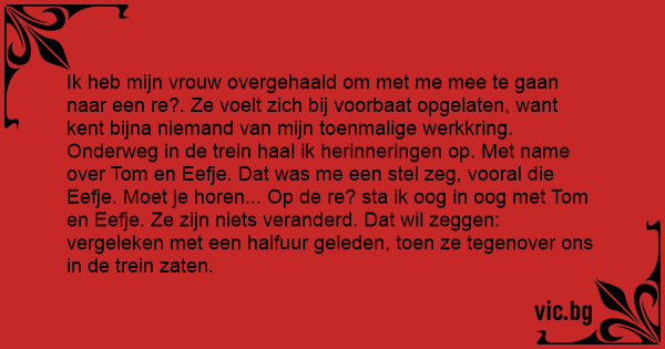 Ik heb mijn vrouw overgehaald om met me mee te gaan naar een re?. Ze voelt zich bij voorbaat opgelaten, want kent bijna niemand van mijn toenmalige werkkring. Onderweg in de trein haal ik herinneringen op. Met name over Tom en Eefje. Dat was me een stel zeg, vooral die Eefje. Moet je horen... Op de re? sta ik oog in oog met Tom en Eefje. Ze zijn niets veranderd. Dat wil zeggen: vergeleken met een halfuur geleden, toen ze tegenover ons in de trein zaten.