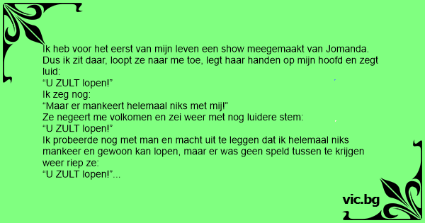 Ik heb voor het eerst van mijn leven een show meegemaakt van Jomanda. Dus ik zit daar, loopt ze naar me toe, legt haar handen op mijn hoofd en zegt luid: