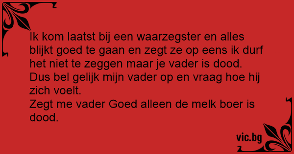 Ik kom laatst bij een waarzegster en alles blijkt goed te gaan en zegt ze op eens ik durf het niet te zeggen maar je vader is dood.