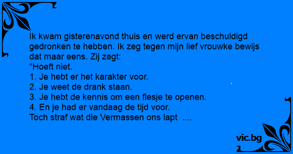 Ik kwam gisterenavond thuis en werd ervan beschuldigd gedronken te hebben. Ik zeg tegen mijn lief vrouwke bewijs dat maar eens. Zij zegt: