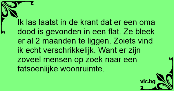 Ik las laatst in de krant dat er een oma dood is gevonden in een flat. Ze bleek er al 2 maanden te liggen. Zoiets vind ik echt verschrikkelijk. Want er zijn zoveel mensen op zoek naar een fatsoenlijke woonruimte.