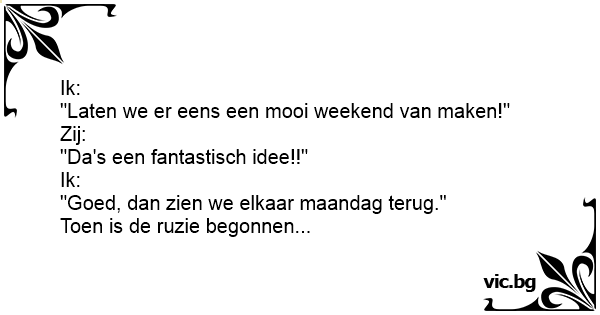 — Любий, давай влаштуємо один одному прекрасні вихідні. — Давай! — Добре! Тоді до понеділка!