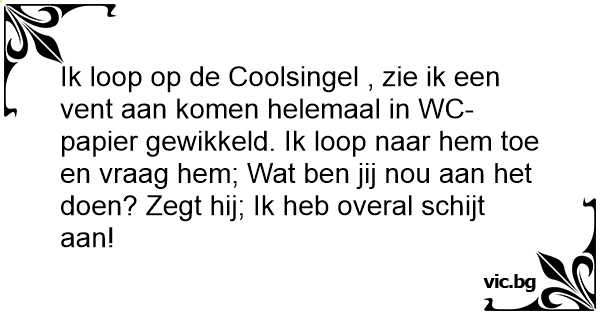 Ik loop op de Coolsingel , zie ik een vent aan komen helemaal in WC-papier gewikkeld. Ik loop naar hem toe en vraag hem; Wat ben jij nou aan het doen? Zegt hij; Ik heb overal sсhijт aan!
