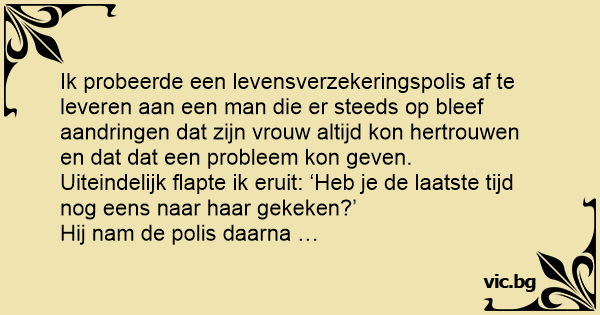 Ik probeerde een levensverzekeringspolis af te leveren aan een man die er steeds op bleef aandringen dat zijn vrouw altijd kon hertrouwen en dat dat een probleem kon geven. Uiteindelijk flapte ik eruit: ‘Heb je de laatste tijd nog eens naar haar gekeken?’ Hij nam de polis daarna …