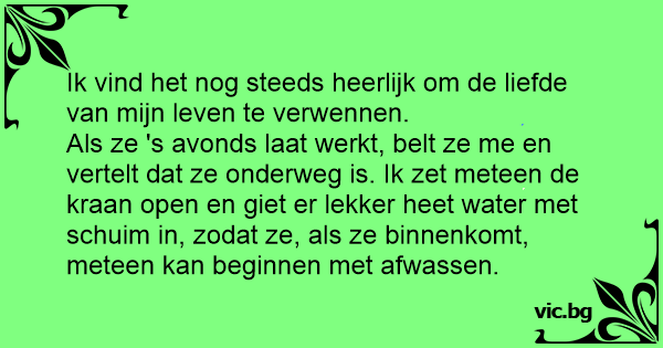 Als ze 's avonds laat werkt, belt ze me en vertelt dat ze onderweg is. Ik zet meteen de kraan open en giet er lekker heet water met schuim in, zodat ze, als ze binnenkomt, meteen kan beginnen met afwassen.