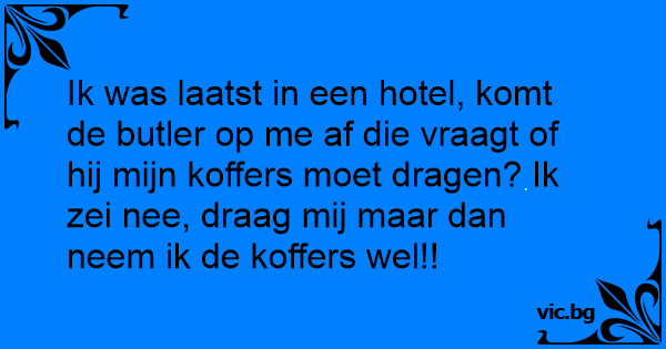 Ik was laatst in een hotel, komt de butler op me af die vraagt of hij mijn koffers moet dragen? Ik zei nee, draag mij maar dan neem ik de koffers wel!!