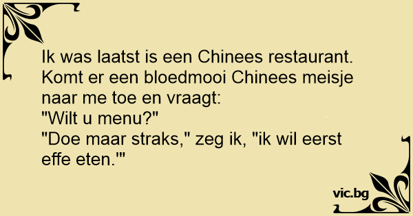 Ik was laatst is een Chinees restaurant. Komt er een bloedmooi Chinees meisje naar me toe en vraagt:
