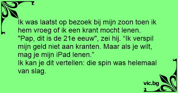 "Pap, dit is de 21e eeuw", zei hij. “Ik verspil mijn geld niet aan kranten. Maar als je wilt, mag je mijn iPad lenen.”