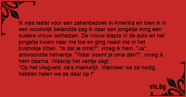 Ik was laatst voor een zakenbezoek in Amerika en toen ik in een woonwijk belandde zag ik daar een jongetje innig een oudere vrouw omhelzen. De vrouw stapte in de auto en het jongetje kwam naar me toe en ging naast me in het bushokje zitten. "Is dat je oma?", vroeg ik hem. "Ja", antwoordde hetventje. "Waar woont je oma dan?", vroeg ik hem daarna. Waarop het ventje zegt :
