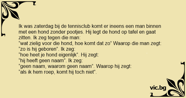 Ik was zaterdag bij de tennisclub komt er ineens een man binnen met een hond zonder pootjes. Hij legt de hond op tafel en gaat zitten. Ik zeg tegen die man: