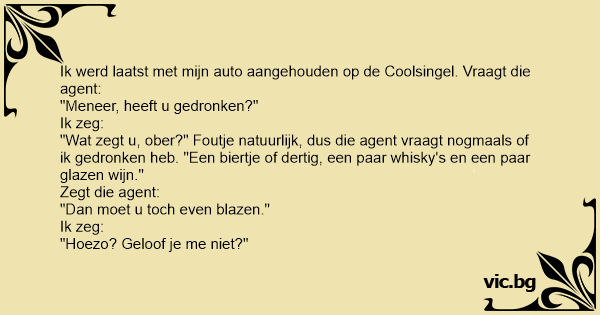 "Wat zegt u, ober?" Foutje natuurlijk, dus die agent vraagt nogmaals of ik gedronken heb. "Een biertje of dertig, een paar whisky's en een paar glazen wijn."
