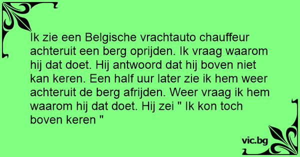 Ik zie een Belgische vrachtauto chauffeur achteruit een berg oprijden. Ik vraag waarom hij dat doet. Hij antwoord dat hij boven niet kan keren. Een half uur later zie ik hem weer achteruit de berg afrijden. Weer vraag ik hem waarom hij dat doet. Hij zei " Ik kon toch boven keren "