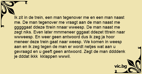 Ik zit in de trein, een man tegenover me en een man naast me. De man tegenover me vraagt aan de man naast me gggggaat ddeze ttrein nnaar wweesp. De man naast me zegt niks. Even later mmmeneer gggaat ddezet tttrein naar wwweesp. En weer geen antwoord dus ik zeg ja hооr meneer deze trein gaat naar weesp. We komen in weesp aan en ik zeg tegen de man er wordt netjes wat aan u gevraagd en u geeft geen antwoord. Zegt de man ddddenk je dddat ikkk kklappen wwwil.