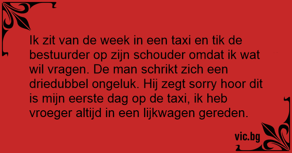 Ik zit van de week in een taxi en tik de bestuurder op zijn schouder omdat ik wat wil vragen. De man schrikt zich een driedubbel ongeluk. Hij zegt sorry hооr dit is mijn eerste dag op de taxi, ik heb vroeger altijd in een lijkwagen gereden.