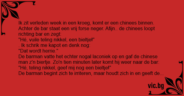 Ik zit verleden week in een kroeg, komt er een chinees binnen. Achter de bar staat een vrij forse nеgеr. Afijn.. de chinees loopt richting bar en zegt: