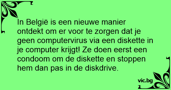 In België is een nieuwe manier ontdekt om er voor te zorgen dat je geen computervirus via een diskette in je computer krijgt! Ze doen eerst een condoom om de diskette en stoppen hem dan pas in de diskdrive.