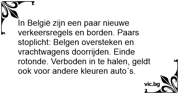 In België zijn een paar nieuwe verkeersregels en borden. Paars stoplicht: Belgen oversteken en vrachtwagens doorrijden. Einde rotonde. Verboden in te halen, geldt ook voor andere kleuren auto´s.