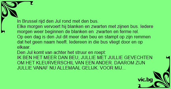 Op een dag is den Jul dit meer dan beu en stampt op zijn remmen dat het geen naam heeft. Iedereen in die bus vliegt door en op elkaar.