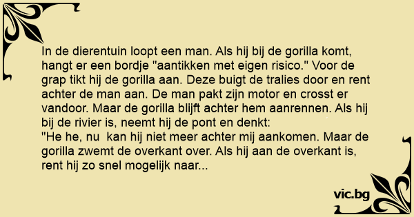 Gorilla hijgend aanzetten. "Oh, nee" denkt de man, "mijn laatste uurtje heeft geslagen." Dan komt het massale beest naar hem toe, tikt hem aan en zegt: