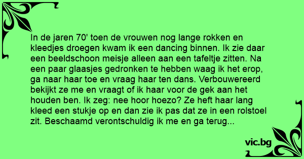 In de jaren 70' toen de vrouwen nog lange rokken en kleedjes droegen kwam ik een dancing binnen. Ik zie daar een beeldschoon meisje alleen aan een tafeltje zitten. Na een paar glaasjes gedronken te hebben waag ik het erop, ga naar haar toe en vraag haar ten dans. Verbouwereerd bekijkt ze me en vraagt of ik haar voor de gek aan het houden ben. Ik zeg: nee hооr hoezo? Ze heft haar lang kleed een stukje op en dan zie ik pas dat ze in een rolstoel zit. Beschaamd verontschuldig ik me en ga terug naar de toog.
