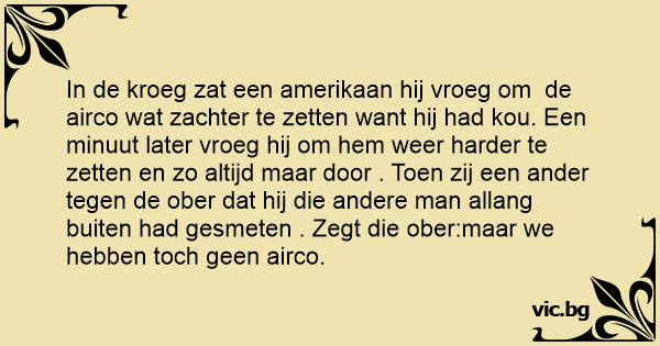 In de kroeg zat een amerikaan hij vroeg om de airco wat zachter te zetten want hij had kou. Een minuut later vroeg hij om hem weer harder te zetten en zo altijd maar door . Toen zij een ander tegen de ober dat hij die andere man allang buiten had gesmeten . Zegt die ober:maar we hebben toch geen airco.