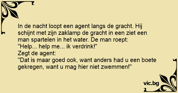 In de nacht loopt een agent langs de gracht. Hij schijnt met zijn zaklamp de gracht in een ziet een man spartelen in het water. De man roept: