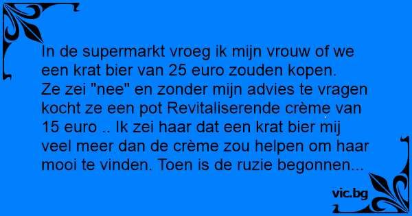 Ze zei "nee" en zonder mijn advies te vragen kocht ze een рот Revitaliserende crème van 15 euro .. Ik zei haar dat een krat bier mij veel meer dan de crème zou helpen om haar mooi te vinden. Toen is de ruzie begonnen...