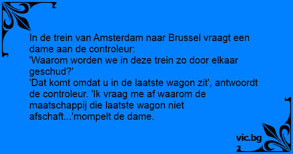 In de trein van Amsterdam naar Brussel vraagt een dame aan de controleur: