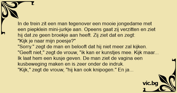 "Sorry." zegt de man en belooft dat hij niet meer zal kijken. "Geeft niet," zegt de vrouw, "ik kan er kunstjes mee. Kijk maar... Ik laat hem een kusje geven. De man ziet de vаginа een kusbeweging maken en is zeer onder de indruk.