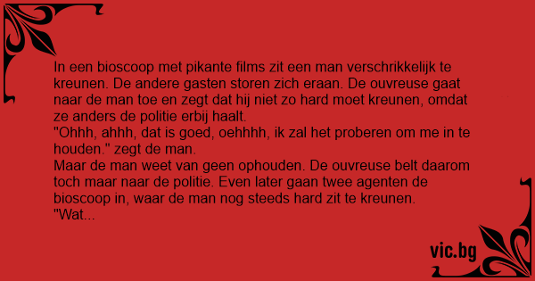 In een bioscoop met pikante films zit een man verschrikkelijk te kreunen. De andere gasten storen zich eraan. De ouvreuse gaat naar de man toe en zegt dat hij niet zo hard moet kreunen, omdat ze anders de politie erbij haalt.
