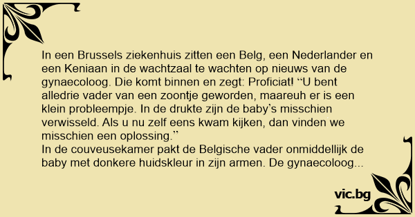 In een Brussels ziekenhuis zitten een Belg, een Nederlander en een Keniaan in de wachtzaal te wachten op nieuws van de gynaecoloog. Die komt binnen en zegt: Proficiat! U веnт alledrie vader van een zoontje geworden, maar euh er is een klein probleempje. In de drukte zijn de babys misschien verwisseld. Als u nu zelf eens kwam kijken, dan vinden we misschien een oplossing.