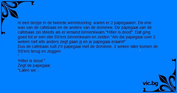 In een dorpje in de tweede wereldoorlog waren er 2 papegaaien. De ene was van de cafebaas en de andere van de dominee. De papegaai van de cafebaas zei steeds als er iemand binnenkwam "Нiтlеr is dood". Dat ging goed tot er een stel SS'ers binnenkwam en zeiden "Als die papegaai over 2 weken niet iets anders zegt gaan jij en je papegaai eraan!!"